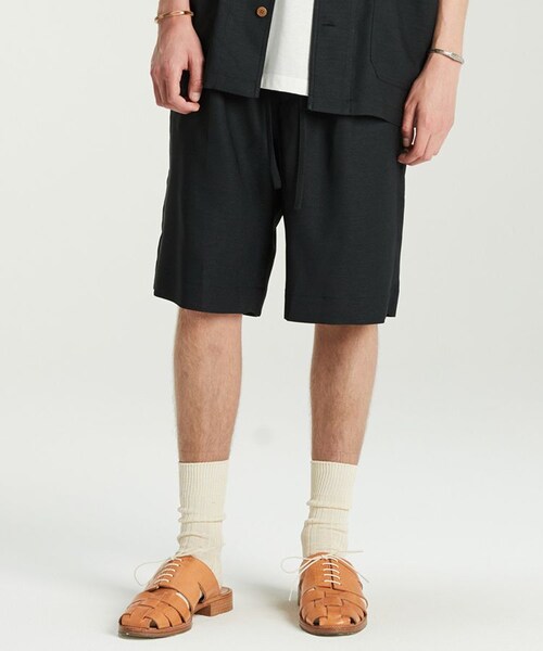「夏のセットアップ」の本命ショーツ。 ダブルステッチや太めのベルトループと言った細かいワークウェアのディテールを取り入れることで、シンプルながらも存在感のあるショーツを完成。 ボタンにはタグア椰子実を原料とした天然素材である、ナット釦を使用。 シルエットは股上を深くとることで、ハイウェストでも着用できるので膝上・膝下とレングスを調整できるので幅広いコーディネートが可能です。
