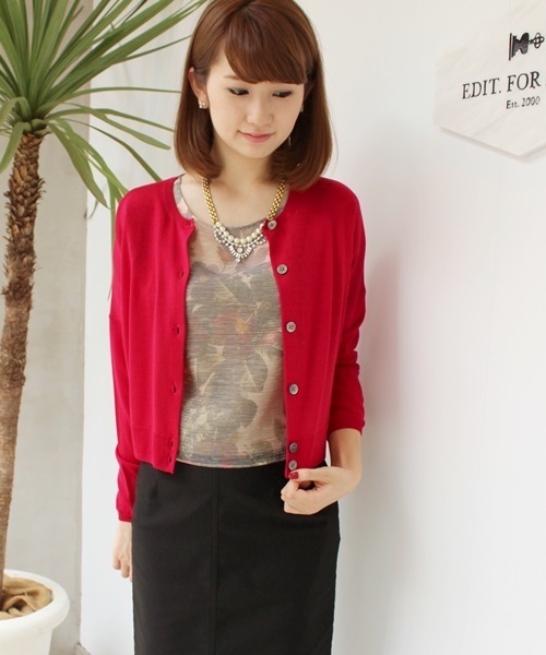さらっとしたウールで綺麗な目面のニットです。 今季トレンドのジャストウエストにぴったりなボクシーラインのショートカーディガン。 短すぎない丈感はワンピースにもバランスよく羽織れる一枚です。 綺麗な赤に近いピンクやグリーンも揃えた4色展開。 どんなシーンにも活躍頂ける便利で万能なアイテムです。 ※店頭での撮影画像は、光の当たり具合で色味が違って見える場合があります。商品の色味は、スタジオ撮影の画像をご参照ください。 shopmodelH166 着用サイズ:FREE modelH163 B78 W58 H84 着用サイズ:FREE