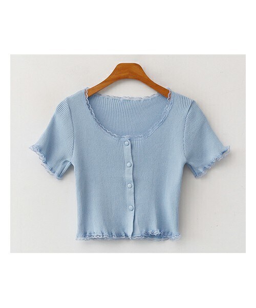 爽やかな印象のクロップドリブカーディガン♡ スリムなシルエットが女性らしい雰囲気漂うカーディガンで、ネックと袖口、ヘムラインにスカラップレースを施してとても可愛いです。 クロップド丈なので、ハイウエストボトムと合わせるとバランスよく決まります。 ボタンを留めてプルオーバー感覚で着こなすのがオススメ♪