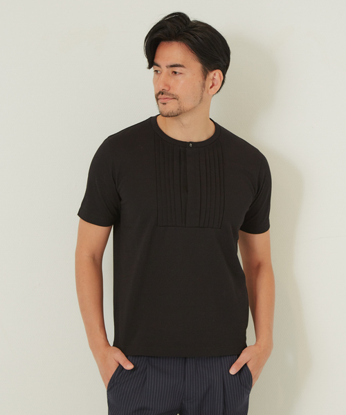 オックスシャツ地の様な組織が特徴のジャージ素材を使いフロントにタックを入れドレッシーなブザムヘンリーTシャツ。手軽にジャケットインナーのアクセントとして使えます。