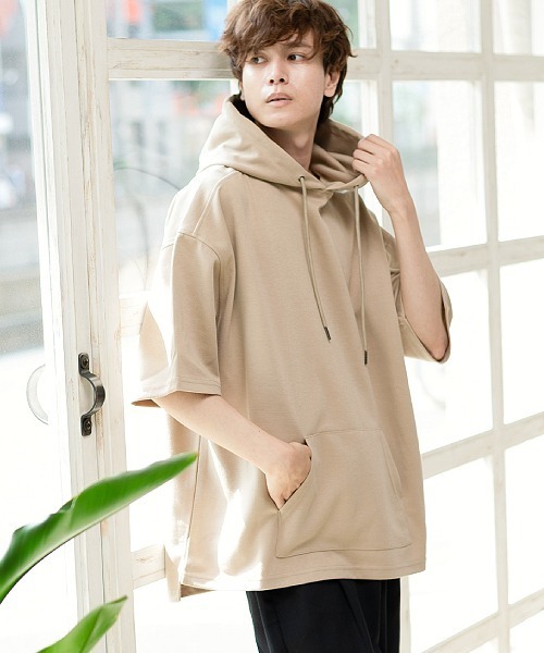 手触りの良い「ポンチ」素材で作られたルーズフィットの5分袖プルオーバーパーカーです。 「ポンチ素材」とはいわゆるジャージ素材の一種になります。 ジャージとの違いは伸縮性は保ちつつも横伸びが少ない利点があります。 さらに形を保ちやすく、軽量で耐久性抜群な素材となり、シワや毛玉ができにくく素材も滑らかで着心地は抜群です。 身頃はややゆったりとしたルーズシルエットでリラックスしたヌケ感を楽しめるサイジングになっています。 大き目に取った身幅の割に、着丈は通常ぐらいにしてありますので、レイヤードスタイルにも使えるアイテムです。 フードやフロントポケット(カンガルーポケット)の作りも徹底してシンプルなデザインですが、こだわりの素材感とシルエットによってひと味違った独自の存在感を醸し出すプルオーバーパーカーです。 ※着用、お取り扱いの際は商品についておりますアテンションタグ、洗濯ネームを必ずご確認ください。 ※店頭及び屋外での撮影画像は、光の当たり具合で色味が違って見える場合があります。 商品の色味はスタジオ撮影の画像をご参照ください。 ※商品の色味につきまして、お客様のお使いのPCのモニター環境により実際のカラーと画像の色味が違って見える場合が御座います。予めご了承の上、ご注文下さい。