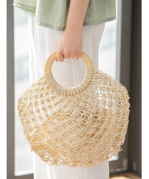 ナチュラルな雰囲気がシーズンスタイルに映えるフィッシュネットバッグ 大きめの網目の透け感が涼しげなネットバッグ。ナチュラルな雰囲気漂う、ウッド素材のラウンドハンドルがアクセントを効かせます。巾着が付いているので小物も収納して持ち運べ、あえて見せるアイテムを入れて透け感を活かしたコーディネートも楽しめます。 ※撮影時のライティング、PCやスマートフォンの環境により写真の色味が実際の商品と異なって見える場合がございます。ご了承の上お買い求め下さいませ。 ※モデル着用画像は実際の色と多少異なる場合がございますのでマネキン画像をご確認ください。 《 お知らせ 》 ▼商品のお気に入り登録 お気に入りアイテムの値下げ・再入荷・在庫1点などの通知を受け取ることができます。 ▼ブランドのお気に入り登録 新商品や再入荷、セール、クーポン配布などお得な情報を受け取ることができます。