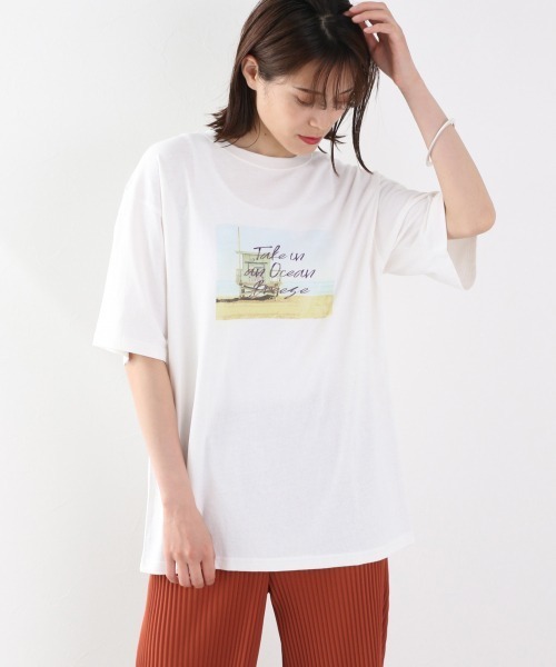 定番の少し大きめサイズのボデイに、フォトをプリントしました。アートやロゴをカラーにすることで夏らしさを出してます。ボトムはスカート、パンツどちらとも相性が良いです。一年通してお使いいただける便利なアイテムとなっています。