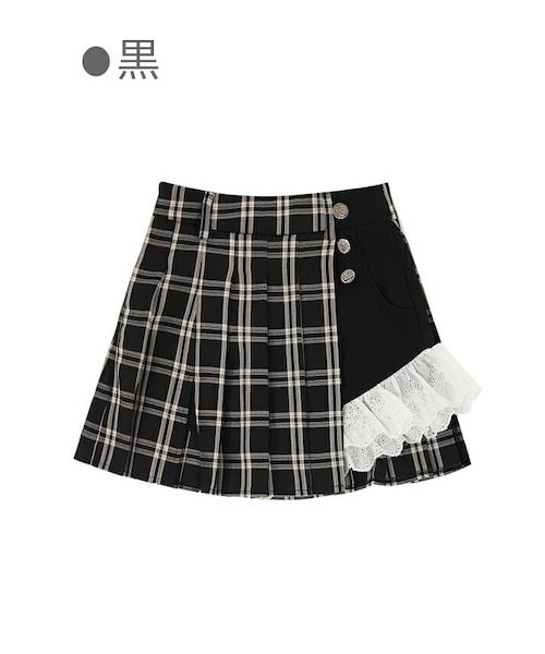 ショーパン+プリーツスカートのレイヤードCODE風 同色系のショーパン&チェック柄で統一感UP 左サイドは丈感短めのコットンレースショーパン 右サイドはスリット入りチェック柄プリーツスカート 後ろから見ると一見普通のプリーツスカートだよ 角度を変えて楽しむアイテムとして斬新すぎる オリジナルティに富んだデザイン性でキャラ立ち度MAX 「ワインレッド」「ピンク」「黒」の3色展開