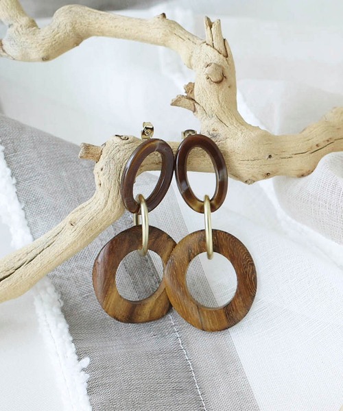 \シンプルになりがちな夏のコーデのアクセントに♪/ メタルのパーツとの異なる質感を組み合わせた、ボリュームたっぷりなピアス。ナチュラルな印象のウッドパーツが季節感漂うアイテムです。