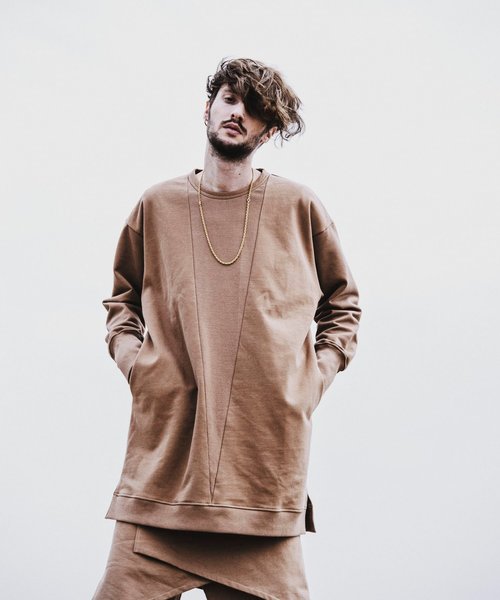 2020 AUTUMN WINTER NO ID. COLLECTIONこちらはプルオーバー、パーカー、パンツと3型共通の生地を使用していますかなり目の詰まったコットン裏毛なのでヘビーに使ってもらってもへたれにくい生地になっています。また若干裏起毛しているので晩秋から初冬にかけて一枚でもちょうどよい生地感です。こちらのビッグガゼットとは古着のスウェットに見られるネック部分に付いたV型のリブを指します。こちらは30?50年代のモデルに多かった両Vをデザインソースとし本来は首元までしかないガゼットを裾まで伸ばしてデザインの主役に持っていきました。同色リブを使う事で馴染みの良い切替になっています。袖ぐりや身幅のゆとりある広さでとても、動きやすくなっています。袖のリブも通常よりも長く出しているのもポイントです。