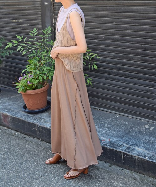 ◆アイテム詳細◆ 肌触りの良いなめらかなカットリブ素材のマキシスカート。 落ち感のあるカラー・素材感があり、トップスはスッキリしたシルエットのものが相性◎ ブラウスやシャツなどゆるめトップスと合わせてルーズでゆるラフな印象に着るのもオススメ。 休日のOFFスタイル等ご自宅用にも最適なリラックス感のある履き心地が魅力。上品に着られる絶妙なフレアシルエットが、大人の女性らしい着こなしに導いてくれます。 ーーーーーーーーーーーーーーーーーーーーーー 【セレクト】gleam 【COLOR】ライトカーキ・ブラウン 【SIZE】Fサイズ 平置き(㎝) 着丈90 ウエスト31-36 裾幅106 【素材】表地 ポリエステル 94% ポリウレタン 6% 裏地 ポリエステル 100%