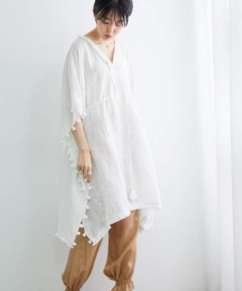 BENARAS by CITRUS(ベナラスバイシトラス)コットン&リネン ワンピース袖口から裾まで付いたポンポンと襟元にはフリンジが施されたカフタンチュニックは、アダム エ ロぺでしか買えない限定モデル。身頃全体に刺繍も施されており、素材に表情感もあります。流れるような素材のボリュームが、動くたびに女性らしく鮮やかな印象を残してくれるトップスです。リラックス感のあるたっぷりとした身頃を、胸元下の紐で自分のスタイルに合わせてバランスを調整する事ができ、体系を選ばず、幅広い世代の方に着用頂けます。長めのチュニック丈のため細身のパンツとのレイヤードを楽しんだり、今年らしくハーフパンツと合わせたスタイリングも素敵です。透け感のある軽やかなインド製コットンリネンを使用。爽やかなリネンにコットンをプラスすることで、ふんわりと優しい肌あたりの心地よい素材となっています。カラーは白と黒のモノトーン展開で、カジュアルシーンだけでなく洗練された都会的なスタイリングにも馴染みます。【BENARAS by CITRUS(ベナラスバイシトラス)】インドのアクセサリー&ストールブランド【CITRSU(シトラス)】が手掛けるウェアブランド。ヨーロッパの現代的な感性と、高い技術を持ったインドの職人による伝統的な染めや刺繍が融合し、高いクオリティと繊細な美しさが生み出されています。