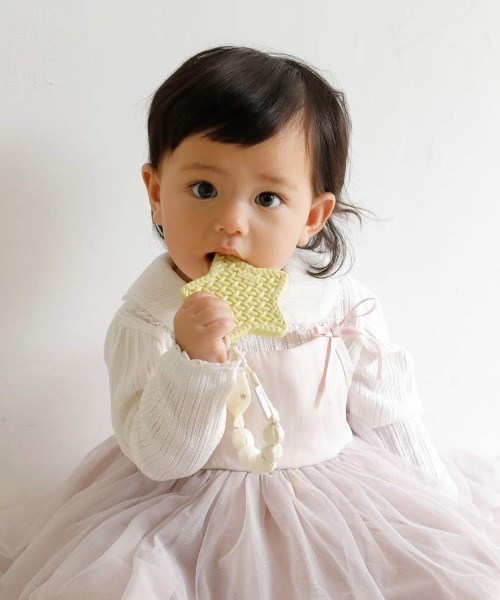 キュートなデザインとカラーリングが◎ ホルダー付きが嬉しいの歯固め。 ■デザイン 毛糸で編んだようなデザインがキュートなシリコーン製の歯がためです。シリコン部分の凹凸が赤ちゃんの歯の生え始めのムズムズ感を解消します。 また、離乳食を食べる準備段階での「噛む」練習になります。 ホルダー付きなので、スタイやお洋服にとめることができ安心です。 日本製、食品衛生法をクリアしたBPAフリー、フタル酸フリーの安心安全なシリコーン製。 耐熱150℃で、煮沸や食器洗い洗浄機でのお手入れができます。 ブルー/グレーは雲の形、イエロー/ピンクは星の形となります。 思わず写真をとりなくなるキュートなデザインです。 歯固め部分を取り外せばマルチクリップとして使えるのもうれしいポイントです。 ■使用シーン ・おうち時間にかみかみ ・お出かけの時のおもちゃとして ・車でのお出かけの時に ・フォトジェニックなアイテムは出産祝いにもおすすめです ■サイズ 歯がため:約8×8cm ホルダー長さ:23㎝(ひも部分8㎝) ■対象年齢 3ヶ月〜12ヶ月 ■歯固め:ご使用上の注意 ・ご使用する際、保護者の方はお子様から目を離さないようにしてご使用ください。 ・傷や亀裂など異常が生じた場合には、直ちにご使用をおやめください。誤飲など、事故の原因になります。 ・歯固めホルダーのクリップ部分を口に入れないよう、歯固めホルダーは、布類など(スタイ、ハンカチなど)に挟んでご使用ください。 ・長時間使い続けるのはおやめください。・火気や暖房器具などには近づけないでください。 ・ご使用中の万が一の事故の責任は負いかねますので、予めご了承ください。 ・電子レンジや湯煎後は火傷にご注意ください。 ・漂白剤のご使用はおやめください。 ・用途目的以外のご使用はおやめください。 ・初回開封時は、水またはぬるま湯で洗浄してからご使用ください。 ・シリコーンの特性上、経時と共に黄ばみますが、品質に問題はございません。 【歯固めホルダー:ご使用上の注意】 ・部品がとれたり破損、変形した場合は直ちに使用を中止してください。 ・使用中はお子様から目を離さないでください。口に入れたり、体をはさんだり、首に巻きつけないように注意してください。 ・はさむ生地によっては跡がつく場合がありますので、傷んで困るものには使用しないでください。
