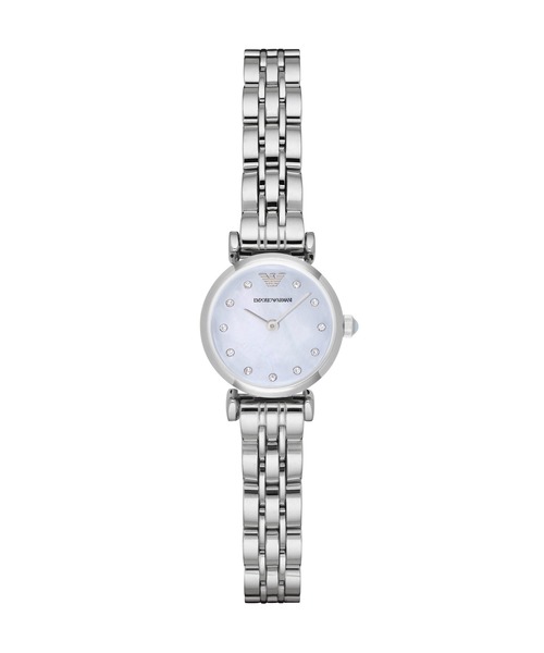 スタイリッシュなシルバートーンのブレスレットが、ペールブルーのマザーオブパールダイヤルに視線を誘導するEmporio Armani レディースウォッチ。ダイヤルにはクリスタルのインデックスとEAロゴをあしらいました。コレクション名:ケースサイズ:22MMラグ幅:10MM防水: 3気圧ムーブメント:クォーツ表示:アナログ輸入: 正規品保証:2年間【 EMPORIO ARMANI について 】1981年にイタリア、ミラノで誕生したブランド。デザイナーはジョルジオ・アルマーニ。着心地と自由な発想を大切にしながら、都会的で洗練されたアイテムの数々を提案しています。イタリア語でエンポリオとは「あらゆるものが手に入る大きな市場」という意味。その名のとおり、エンポリオ アルマーニではメンズ、ウィメンズの洋服、小物はもちろん、時計や香水、アンダーウェア、スポーツウェアなど幅広いアイテムを展開しています。< クオーツ製品の電池について >お買い上げ時に時計にセットされている電池は、動作確認用のモニター電池です。出荷前の保管期間中にも電池は消耗しており、ご購入時点で電池が切れている場合がございます。なお、電池切れは保証の対象外となりますので、あらかじめご了承ください。< ご確認ください >※パッケージは実際の画像と異なる場合がございます。※外箱には、輸送時にキズや凹みが生じる場合がございます。あらかじめご了承ください。※ご利用のモニター環境や照明の影響により、実際の商品と色味が異なって見える場合がございます。※納品書は保証書の代わりとなりますので、大切に保管していただきますようお願いいたします。※商品タグに記載している価格につきまして、旧価格のものが混在している場合がございます。それにより、商品に表示されている価格と異なるタグが付いている場合がございますが、正しい販売価格はご注文時に画面に表示された価格となります。ご了承下さいますよう、お願い申し上げます。