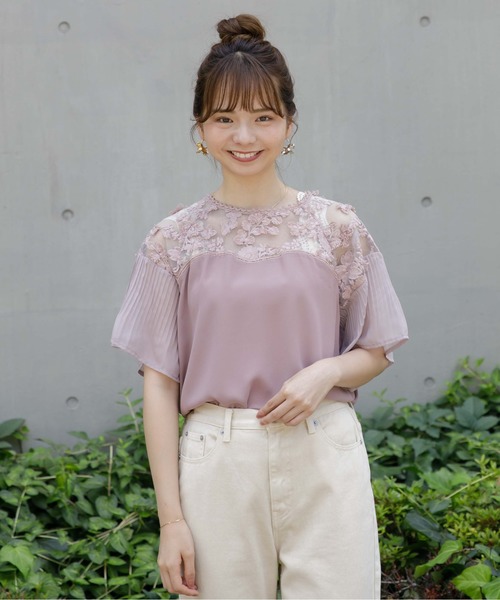 透明感溢れるレースを贅沢にあしらったデザインブラウス。胸元に透け感のある素材をあてこむことで抜け感を出しました。袖は繊細なシフォンにプリーツ加工を施しふんわり柔らかい雰囲気に♡気になる二の腕もカバーできるのが嬉しいポイント。素材で遊びシルエットはシンプルにおつくり致しましたので、甘い印象になりすぎず大人かわいく着ていただけます。