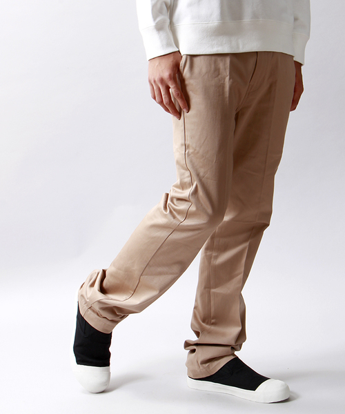 【Dickies★WEGO】 "Dickies"(ディッキーズ)に別注を掛けたトラウザーパンツ。綿とポリエステルの混紡が定番であるディッキーズのパンツを、敢えて綿100%で仕上げました。コシのある仕立ては残しつつも、柔らかく着心地が良いのが特徴です。また、腿周りにゆとりを設けているのでリラックスして快適に着用頂けるひと品。そのまま穿いて頂くのは勿論、ロールアップしてソックスやアンクレットと組み合わせた、ラフな着こなしもオススメです。 ブラック model:H194 ベージュ・ネイビー model:H179 店舗にてお問い合わせの際は、下記の品名・品番をお申し付け下さい。 品名:Dieckiesチノトラウザー 品番:143M40WG02 ※画像の商品はサンプルです。 実際の商品と仕様、加工、サイズが若干異なる場合がございます。 WEGOの特集ページはコチラ