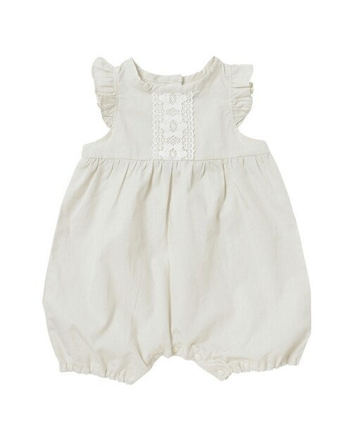 フリル袖と胸元のレース、丸みを帯びた愛らしいシルエットが印象的なオールインワン。 中に襟付きのインナーを合わせたり、カーディガンとコーディネイトするのもおススメです。 ソフトな春らしいカラーリングが大人っぽくおしゃれな雰囲気に。 股下がホックになりますので、ベビーへの着せ替えやおむつ替えも簡単にできます。 通年着ていただけるので、ギフトでも喜ばれるアイテムです。 素材:本体:綿100%
