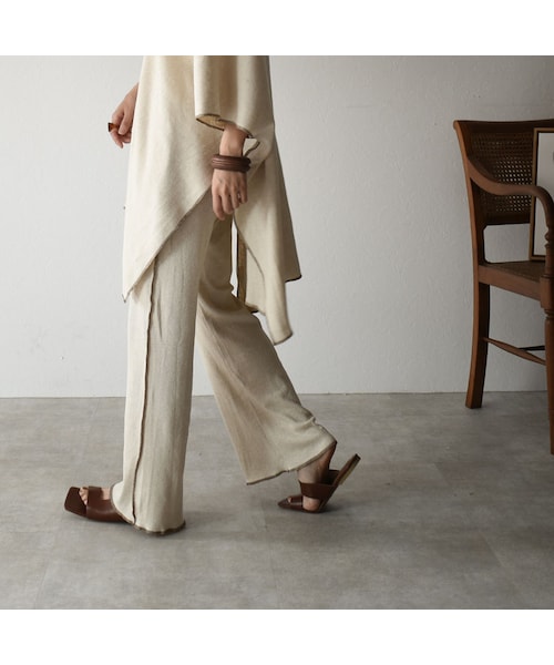 made in Japan リラックスムード漂うコットンリネン素材を使用したリブフレアパンツです。少し細身のフレアシルエットで、単品使いはもちろん、同素材のトップス(tops-04040)とセットアップとして着用頂けます。アウトシームデザインで、エクリュカラーにはモカカラーの糸を使用しサイドにポイントに。モカには同色の糸を使用しシンプルに大人っぽい印象に仕上げました。ウエストはゴムでリラックスした穿き心地。素材にはコットンリネンを使用し柔らかく、ナチュラルな風合いにもこだわりました。 (モデル身長166cm) ※モデルはセットアップ着用時、ルーズ感を出す為にパンツを少し下げて着用しています。股下寸をご確認の上ご購入下さい。 ※こちらは『リブパンツのみ』の商品ページとなります。同素材のカフタン(tops-04040)は別売りで下記なりますので、ご了承の上ご購入下さい。 https://lavishgate.net/items/5ef1b290b5a425208e4c50dd ※ウエストゴム。ポケットなし。 ■素材 綿85% 麻15% ※エクリュは濃色の下着の場合透ける場合がございます。 ■サイズ ウエスト(ゴム上がり) 62cm ヒップ 90cm 股上 28cm わたり 27cm 股下 71cm 裾幅 27cm こちらは、クロネコ宅急便で発送商品になりますので、お届けまでに発送から1~2日かかります。