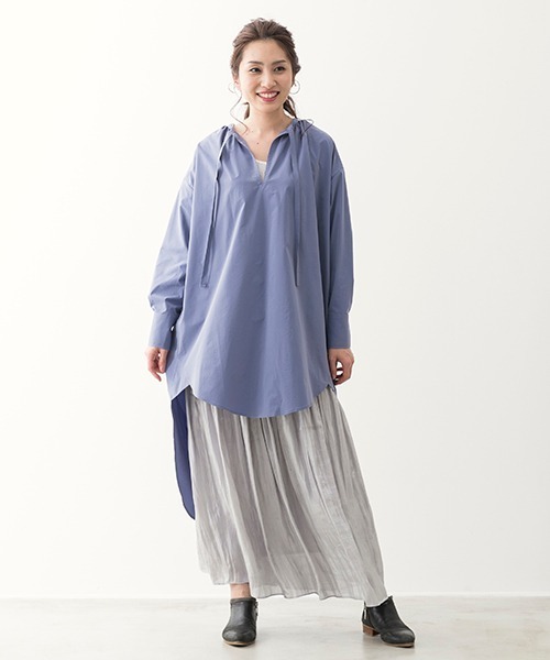 リラックス感あふれるチュニック丈のブラウス。 ボリュームのあるシルエットと後ろの裾丈を長くあしらった大胆なデザインが魅力。 シワになりにくい素材を使っているのでデイリーに着やすく、旅行にもおすすめです。 ネックベルトは結んでも、そのまま垂らしてもサマになります。 着丈前後差あり 前86cm 後109cm ※商品画像はサンプルのため、色味やサイズ、仕様等に変更が生じる場合がございますので、予めご了承ください。