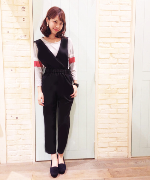 Kastane(カスタネ) 深めのV開きになったサロペット。無地ならどんなアイテムにも好相性です!ウエストがゴムになっていて楽に着て頂けます☆足元に向かって少しだけ先細りになっているので、スッキリスタイル良く見えます◎