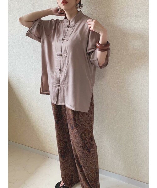 misato- select #パウダーサテンチャイナブラウス ドレスアップからカジュアルまで、スタイルの中心になります。 その安定感が多様な着こなしを実現したチャイナシャツ◎ 柔らかな生地で触れても心地良く洗練されたデザイン、 普段使いしやすくサッと着るだけでオシャレになれる アイテムデニムやスウェットなど色々なボトムにマッチします。