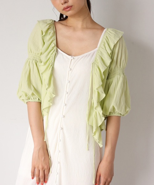 ~NICECLAUP 2020 Summer Collection~■夏にピッタリな羽織りブラウスが登場!!からみ生地の夏にピッタリなフリルがポイントの羽織り。フロント部分にリボンのディティールが施されておりさらに可愛さをプラス。バルーン袖になっているので、腕の華奢魅せも叶います。ブラウスとしても、羽織りとしても着回せる万能アイテムです。キャミワンピースに羽織ったり、レースパンツとの合わせが今年らしくて◎※サンプルでの撮影のため、実際のものと仕様や色が異なる場合があります。※室内、室外での撮影のため実際より明るく映っていたり、暗く映っていたりする場合がございます。※品質表示を必ずご確認下さい。【商品のお気に入り登録】完売カラーの再入荷や、ラスト1点のお知らせ、セールの通知を受け取ることができます。【ブランドのお気に入り登録】新作入荷や再入荷情報など、ブランドの情報をいち早くお届けします。ぜひご登録ください♪