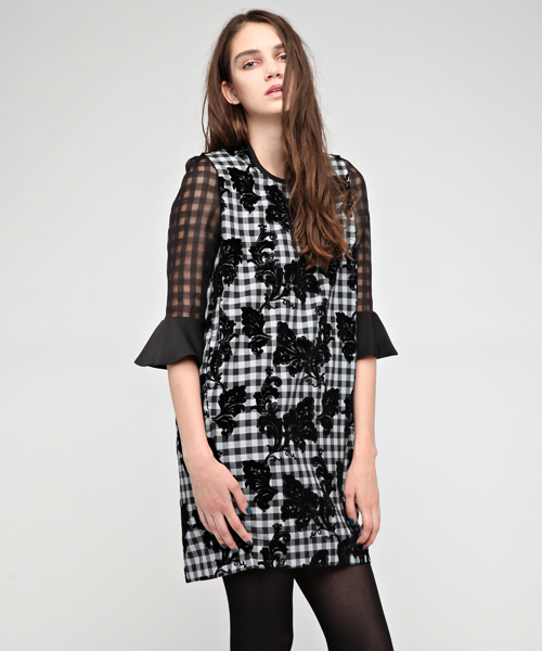 mame 2014 AUTUMN/WINTER COLLECTION チェック×フラワーのフロッキープリントの表情が愛らしいワンピース。スリーブ部分に透け感のある素材を用いることで、程よいヌケ感をプラスしたデザイン。 modelH177 B81 W60 H89 着用サイズ:2