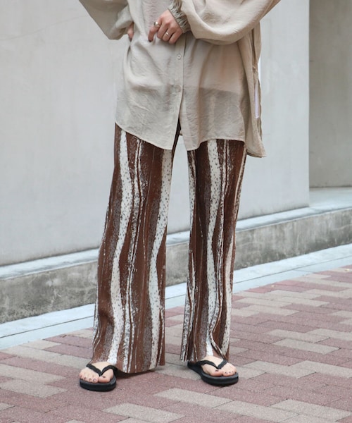 商品名:Sheson(シーズン)ウェーブ柄プリーツパンツ 商品番号:200608-28 商品説明:【2021 SS】 ・ウェーブ柄が可愛いパンツ ・シンプルなトップスとの相性抜群 曲線柄に細い波のようなラインが入ったウェーブ柄のパンツ。 さらにプリーツ加工を施すことで、綺麗なIラインが完成します。 軽い生地を使用し腰から裾までストレートな幅で、細すぎず太すぎずの絶妙なシルエットに。 存在感のある柄なので、シンプルなトップスを合わせるだけで旬なコーデが完成します。 ウエストゴムのゆったりしたサイズ感でリラックスムード漂うアイテム。 丈は長めに作られておりますが、ご自宅でカットオフが可能です。 *商品画像のお色は撮影環境やモニターによって、 実物と若干異なる場合がございます。 *他のサイトと在庫を共有している為、ご注文頂いた商品が欠品となる場合もございます。 ------------------------------------------------------------------------- サイズ:フリーサイズ(モデル155cmBK-/160cm-BK,BR/169cm-BK,BR) ・ウエスト 60~96cm ・総丈 100~103cm*個体差があります ・ヒップ108~134cm ・股上 37cm ・股下 69cm ※個体によって若干異なる場合がございます。 **生地詳細** 【裏地】なし【生地の伸縮】なし【生地の透け感】ややあり 素材:ポリエステル100% カラー:ブラック・ブラウン