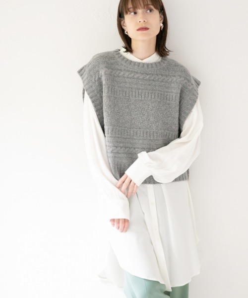 イタリア産のウール糸を使用したベスト。 定番で人気の高いケーブル編みデザインで、ショート丈が今年らしいです。 シャツやワンピースと重ねるだけで簡単にレイヤードスタイルが楽しめるので、 コーディネートの幅が広がるアイテムです。