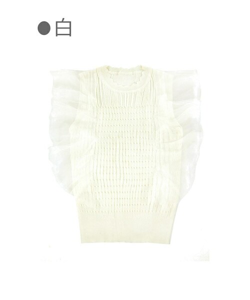 ミニスカラップ襟で首元をデコレート ストレッチが効く薄手ニット素材を使用 発汗性がよく汗でベタつきにくい うでの部分を隠すように同色のチュールを重ね ベストなのにチュールは袖替わりでおしゃれ 女の子らしい抜け感あるコーディネートにぴったり 「白」と「ピンク」の2色展開