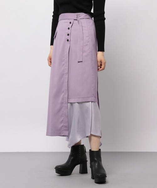 ◆モードな雰囲気のデザインスカート◆ レイヤードスカートとラップスカートをドッキングしたような アシンメトリーなデザインがポイント。 さりげない異素材使いも◎ シンプルなトップス合わせでも決まるデザイン性の高い1着です。 ※撮影環境により、光の当たり具合で 色味が違って見える場合があります。 あらかじめご了承下さい。