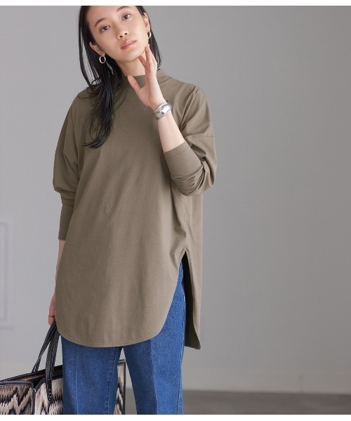 一枚着としてもレイヤードアイテムとしても重宝するADAM ET ROPE' 定番のチュニックTにモックネックバージョンが新登場!【Material】コットン天竺。肉厚なので透けにくく◎ 洗濯してもよれにくく、シワも目立ちにくい、優れた素材です。オールシーズン重宝すること間違いなしの一枚です。※製品でワンウォッシュ加工していますので、購入後の洗濯でほぼ縮みの心配ないです。【Design】引き続き人気のコットンチュニックTEEに、モックネックバージョンが新登場!ゆったりとしたドルマンスリーブで、シンプルながらも存在感のあるシルエットがポイント。裾がシャツテイルになっており、一枚で着ても決まり、寒くなってきたらニットとのレイヤードにも、幅広く長く使えます!モックネック仕様のアクセントがあるだけでどこか洗練された印象に映ります。【Styling point】ボトムを選ばず何にでも合わせやすい、万能なキレイ目ロンT。暑い時期には一枚着としてスラックスやスカート合わせで。寒くなってきたら、ニットとのレイヤードを楽しめます。-----透け:なし裏地:なし伸縮性:あり光沢感:なし生地の厚さ:薄いポケット:なし洗濯方法:手洗い可-----※画像の商品はサンプルです。お届けする商品に仕様・サイズ等の変更が生じる場合がございます。予めご了承ください。※ロケ撮影画像は、光の当たり具合で色味が異なって見える場合がございます。商品の色味は、スタジオ撮影の画像をご参照ください。