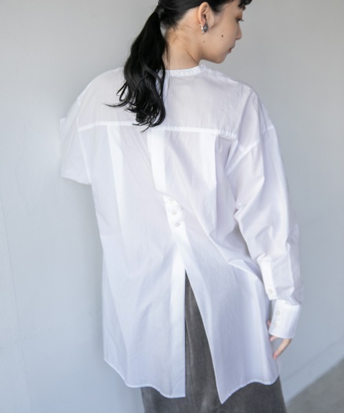 春夏も人気だったバックスリットデザインのドレスシャツ。後ろには深めのスリットがあり、ボタンを閉めても開けてインナーを見せて着てもお洒落なアイテム。お尻が隠れるくらいの丈感にしているので、柄物のパンツや細身のパンツとの相性もGOODです。