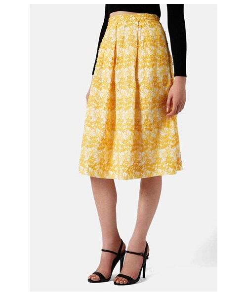 Clean pleats volumize a cotton-blend midi skirt brightened by sunny daisy embroidery. 33" length (size 8). Back zip closure. Unlined. 93% cotton, 7% elastane. Machine wash cold, dry flat. By Topshop; imported. Savvy.