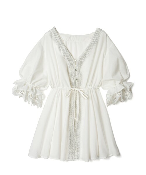 レースを可愛くあしらったフェミニンなブラウス。 袖口は華奢見え出来るキャンディスリーブに。 きゅっと絞れるウエストはスタイリッシュに見せてくれる。 ★レース部分は裁断の関係で、柄の出方が写真と多少異なる場合があります。 ★ウエストゴム入りです。
