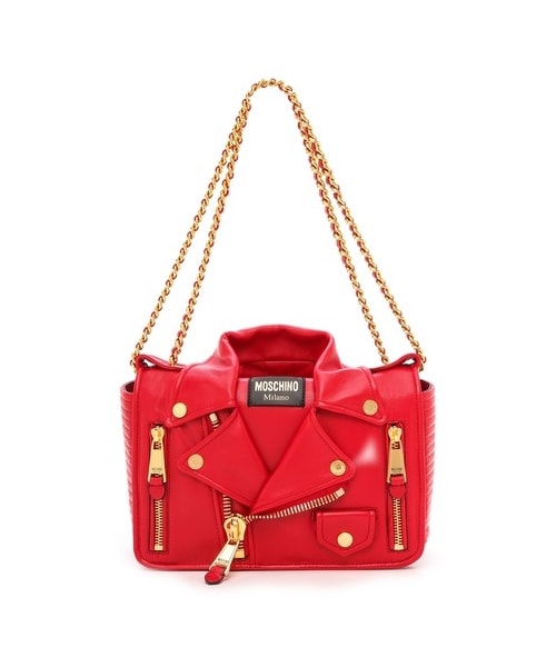 This clever Moschino handbag is detailed with moto-jacket accents, giving the bold accessory a charming illusory element. Chunky zippers and gold-tone hardware add luxe appeal. Magnetic front flap and adjustable, leather-woven chain strap. The logo-lined interior houses a zip compartment and 2 small pockets. Dust bag included. Leather: Sheepskin. Weight: 30oz / 0.85kg. Made in Italy. Measurements Height: 7in / 18cm Length: 12in / 30.5cm Depth: 4in / 10cm Strap drop: 18in / 46cm