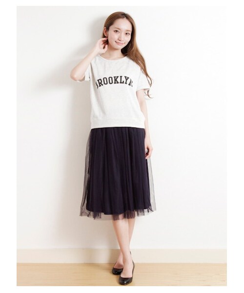 プルオーバーとチュールスカートのセットアップ。人気のロゴアイテムと、ふんわりチュールスカートで甘辛MIXの完成!!別々でも大活躍な、使いまわしやすいアイテムです。※スカート部分のみ裏地あり【モデル身長:約169cm/着用サイズ:Fサイズ】