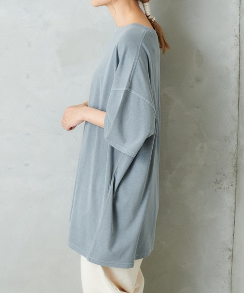 ピュアルセシン 2020 autumn collection【Emotional Luxe】 ミニマルやシンプルをベースにしつつ丸みのあるシルエットやハンドワーク・フェミニンなディテールで心地よい温もりを感じてもらえるスタイルの提案 ◇ヴィンテージ感のある生地で大人カジュアルを気軽に取り入れられるカットソー◇ ピグメント加工されたヴィンテージ感のある生地のカットソー。 ゆったりとしたボックスシルエットでリラクシーな着心地。 雰囲気あるシックなカラーリングは、一足早く秋冬のスタイリングを取り入れられます。 ヒップが隠れる丈感は、どんなボトムスとも相性◎ ・透け感なく着用できるカットソー ・大人カジュアルなカラー展開 ・体のラインを拾わず体型カバー ・コットン100% =============================== 透け感:なし 裏地:なし 伸縮性:ややあり 光沢感:なし 生地の厚さ:普通 洗濯:手洗い可 【スタッフコメント】 年齢:30代後半/身長:155cm/着用サイズ:M サイズ感: ヒップが隠れる丈です。 ワイドパンツと合わせてリラックスコーディネートも楽しめる丈感です。 首回りは詰まりすぎず程よくラウンドしています。 5部袖で、二の腕カバーもしっかりとしてくれるので安心です。 素材感: カジュアルな印象の透け感のないカットソー生地 =============================== ※撮影場所やお使いのモニター環境により若干お色味が異なる場合がございます。特にロケの撮影では明るく見える傾向にございます。 ※予約商品はサンプルで撮影をしております。若干の仕様が変更になる場合がございますので予めご了承の上ご注文くださいますようお願いいたします。