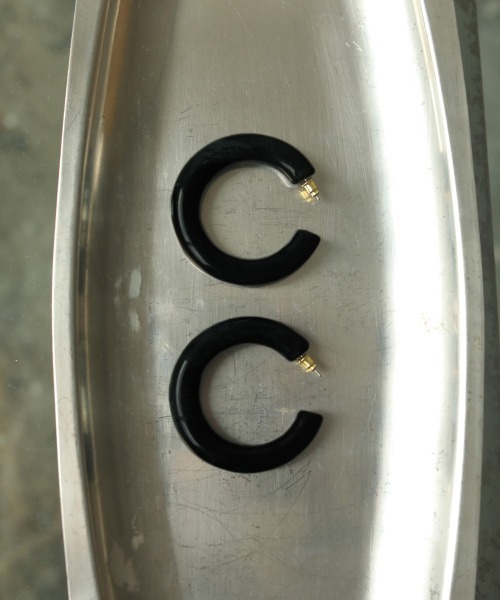顔まわりのアクセントになる大振りのフープピアス。ボルドー、オリーブ、ラベンダーはマーブル仕様。ソリッドなブラックはモダンな印象に◎※樹脂で染めているので色のでかたに多少の違いがあります。