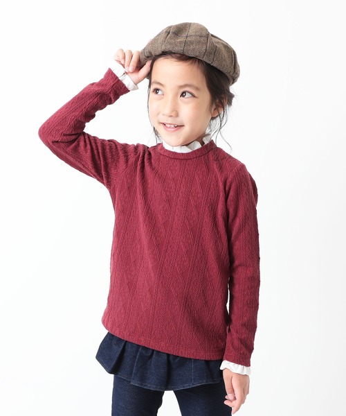 さりげないフリルが女の子らしい『ジャガードフリル長袖Tシャツ』 絶妙なフリル使いとまるでニットのようなデザインがかわいらしい1枚。 合わせ方次第で、ガーリーにもカジュアルにもスタイリングできる万能アイテムです。 ■素材■ ふっくらあたたかな風合いのジャガード素材 ケーブルニットの柄をカットソーで表現。 カットソーなので肌ざわりも良く、ストレッチ性があるため、快適な着心地です。 ■ディティール■ 伸縮性:あり ・背中部分にボタン付き ・裏側にお名前タグ付き