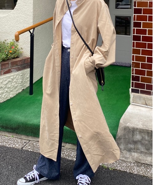 スタイリングを格上げしてくれる袖ボリュームバンドカラーロングシャツワンピース スウェード生地がさらりとした着心地でゆったりとしたシルエットながらも、すっきりと着こなすことができ、二の腕や腰回りの体型カバーもしてくれます。 1枚着はもちろん、羽織のように着用して大人シアーコーディネートを楽しむことができます。 普段使いしやすくスタイリングの主役になるカラーバリエーションは、色違いで取りそろえるのもおすすめです♪ 両サイドには深めのスリットが入っており、パンツやスカート、ブーツを見せたり 羽織として着まわしたりと幅広いレイヤードスタイルが楽しめます。