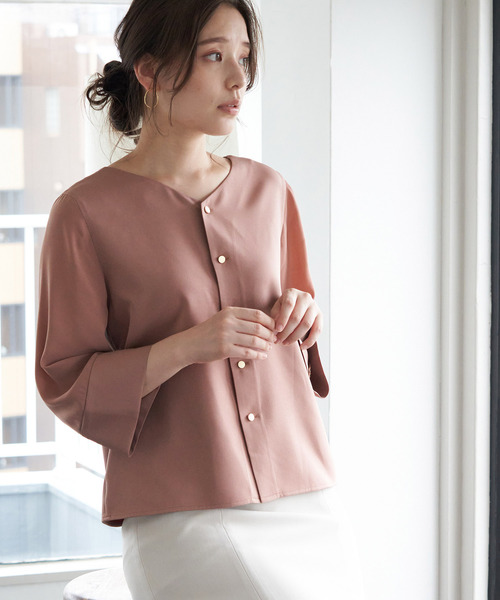 前後のチェンジで変わる表情を楽しんで。透けの出るシフォンスリーブが、軽やかさをプラスする7分袖ブラウス。 前後逆にしても着られる2WAY仕様で、気分やボトムに合わせたスタイリングを楽しめます。 メタルボタンがアクセントとなり、ほんのりリッチな印象へと導いてくれるアイテムです。 ブラック(01)、ラベンダー(53)はWEB限定カラーです。 ・裏地なし ※撮影時の光によって色の見え方が違う場合がございます。