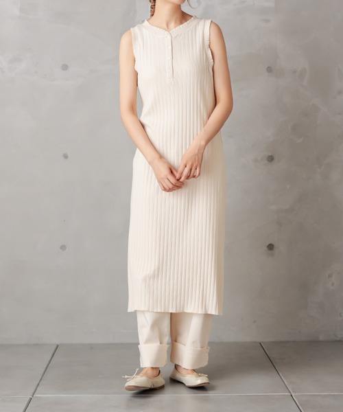 ピュアルセシン 2020 autumn collection【Emotional Luxe】ミニマルやシンプルをベースにしつつ丸みのあるシルエットやハンドワーク・フェミニンなディテールで心地よい温もりを感じてもらえるスタイルの提案 ◇着心地抜群!テレコノースリーブインナー◇ 襟ぐりと袖にフリルが施されたPUAL CE CINでは毎回大好評のノースリーブカットソーです。 こちらはロング丈ver。(同シリーズショート丈:針抜きテレコR no:226600060) 伸縮性抜群で、透け感もなく着用していただけるので 幅広い着こなしに対応できます。 ロング丈はワンピース等の透け防止インナーとしても◎ シャツワンピースやカーディガン等との組み合わせで フリル衿をポイントにした着こなしもおすすめです。 ・透け感なく着用できるカットソー ・伸縮性抜群で、1枚着も可能なロング丈 ・ストンとしたIラインシルエット ・フリル襟でコーディネートにさりげなく甘さをプラス ・コットン100% =============================== 透け感:なし 裏地:なし 伸縮性:あり 光沢感:なし 生地の厚さ:普通 洗濯:手洗い可 【スタッフコメント】 年齢:30代後半/身長:155cm/着用サイズ:M サイズ感: インナーの肩紐も見えずに着用できます。 ほどよく肉厚なカットソーなので、身体のラインが出すぎません。 首回りは詰まりすぎず程よくラウンドしています。 素材感: なめらかな質感で透けのないカットソー生地 =============================== ※撮影場所やお使いのモニター環境により若干お色味が異なる場合がございます。特にロケの撮影では明るく見える傾向にございます。 ※予約商品はサンプルで撮影をしております。若干の仕様が変更になる場合がございますので予めご了承の上ご注文くださいますようお願いいたします。