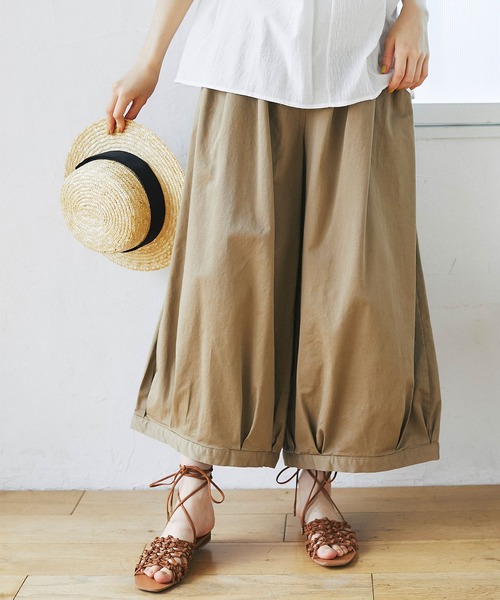 ワイドシルエットのパンツで、裾はさらにワイドでコクーンのような丸い形が可愛いピエロパンツ。しっかりとした生地で、ブラウスやTシャツ、シャツやニットなど合わせやすく、通年使えて◎