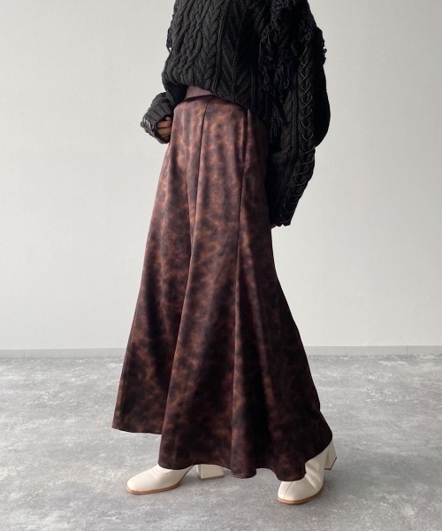 ◆表面感のある程よい肉のサテン地を使用したフレアスカート◆ べっ甲のようなまだらな総柄はモードな雰囲気のダークカラーで展開。 広がりすぎないセミフレアのシルエットも大人な雰囲気で◎ コーデのポイントになるモードなスカートです。 ※撮影環境により、光の当たり具合で 色味が違って見える場合があります。 あらかじめご了承下さい。