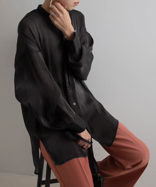 1枚で存在感のあるシャイニーサテンシャツ動くたびに表情が変化するシルキーで美しい光沢感が特徴のポプリン生地を使用。シワ加工風の凹凸があり表情豊か。スルンとした質感が心地良く、落ち感があり動きに合わせて綺麗に揺れる肌触りのいい柔らかな素材です。落ち着いた光沢感なので派手にならず、キレイめにもカジュアルにも着て頂ける1枚です。前後差を付けた着丈とサイドスリットデザインが、こなれ感を演出してくれます。素材感のあるシャツなので、前を開けてさらっと羽織るだけでコーデのポイントに。ベストとの相性も抜群。1枚で存在感のあるアイテムです。**********************透け感:ややあり裏地:なし伸縮性:なし光沢感:あり生地の厚さ:普通********************** ※ご覧のモニター環境や撮影環境により実際の商品と多少色味が異なって見える場合がございます。ご理解の程よろしくお願いいたします。【お買い物をよりお楽しみいただく為に】▼商品のお気に入り登録をおすすめします♡をクリックしてください。完売カラーの再入荷や、ラスト1点の通知、セールの際の通知を受ける事ができます。ブランドのお気に入り登録もご一緒にお願い致します。