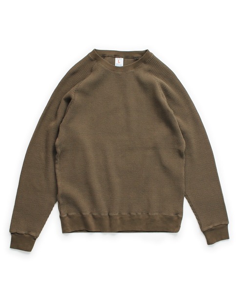 国産のへービーウエイトワッフル生地を使用。ラグラン仕様で肩回りのストレスのない着心地が特徴。襟はフライスをバイヤス付けすることにより強度のあるネックライン。綿100% / 日本製