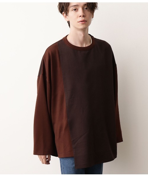 肩先10センチまでドロップしたビックシルエットのプルオーバー。 身幅もたっぷりとした分量感があり、ワイドスリーブで袖口幅も広い、モード感のあるシルエットです。 アシンメトリーのフロントデザインは、ポリエステルの布はく素材と重なりあってコンビネーションとなっていて、裾が段違いになっているエッジの利いたデザインです。 色も布はくパーツとカットソーパーツで微妙に差があり、バイカラーのような印象になります。 色展開はブラックとダークブラウンの2色展開。 まだ残暑のある初秋に1枚で着用したいプルオーバーです。