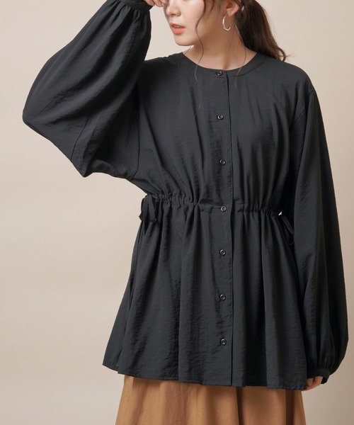 スタイル自在のウエストリボンブラウス華奢見えも狙えるオーバーサイズブラウス。両サイドで絞るドロストリボンがシルエットにメリハリをつけてスタイルアップ効果も期待できます。しなやかでほんのり光沢のある素材が大人っぽい雰囲気に。ボリュームのある袖が手元を女性らしく演出。開きすぎないバンドカラーで着こなしを上品にまとめます。ウエストの絞り方次第でアレンジも自在♪ 裏地なし 伸縮性なし 薄手 前開きボタン留め リボン取り外し不可(調節可) 織キズやしわ等は生地の特質です 洗濯:洗濯機使用可(ネット使用)