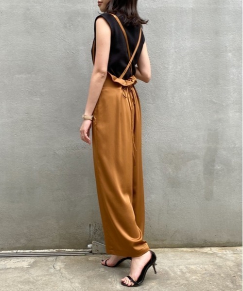 シンプルなデザインで合わせるものを選ばない着回し力抜群のリラクシーなサロペット。ゆったりとしたシルエットで着心地も◎華奢なストラップが大人の女性らしさを演出。柔らかで程よく光沢のあるサテン素材がきれいめな印象をアップ。ニットやゆるめのブラウスを合わせて旬のトップスインでバッチリ決めて。肩紐は取りはずしも可能でトレンドのハイウエストパンツとしても活躍間違いなし。サイズ調整も後ろのリボンで可能なので様々な体型の方におすすめの一枚です。洗濯方法:家庭洗濯可※屋外での撮影や店舗店内での画像は、照明や光の当たり具合で色味が違って見える場合があります。また、サンプルを使用のため商品の色味は、スタジオ撮影が加わり次第参考にご参照ください。
