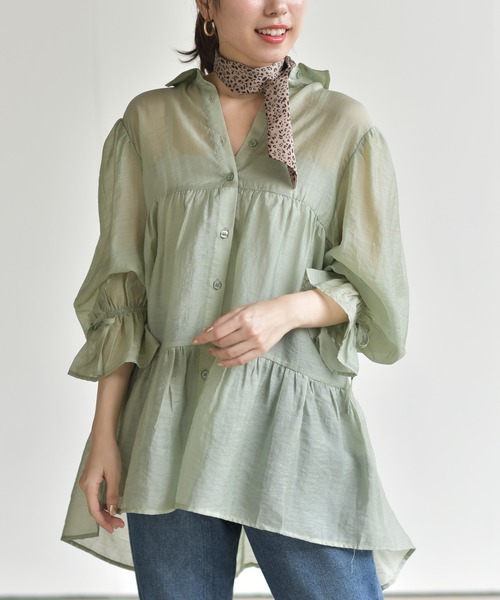 ふんわりティアードのシアーブラウス 旬のシアー素材でトレンドスタイルを演出してくれるブラウス。 ニュアンスたっぷりな光沢とシボ感のある素材を使用しています。 ゆったりとしたシルエットにティアードをあしらってガーリーに。 ボリュームのあるキャンディスリーブは袖口リボンで可愛らしい印象に仕上げました。 また袖口にはゴムを縫い付けてあるのでたくし上げてもOK。 ふんわりエアリーなシルエットで着映え効果も狙えるアイテムです♪ 裏地なし 伸縮性なし 薄手(1枚では透けます) 前開きボタン留め 袖口ゴム仕様 袖口リボンは縫い付けてあります 織キズやしっわ等は生地の特質です 洗濯:手洗い可