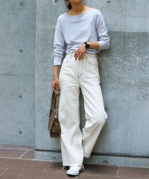 女性らしいぬけ感と広すぎず狭すぎない考え尽くされた絶妙なネックラインカットソー(長袖・綿)。流行に関係なく定番に使えて、色々なボトムスと相性がいいので、持っていると重宝するアイテムです。 程良い開きのボートネックが首元をすっきりと見せてくれ、女性らしさが際立つ雰囲気になります。 たっぷりとした身幅がこなれた"ゆるさ"を演出してくれます。 ・透け感少しあり
