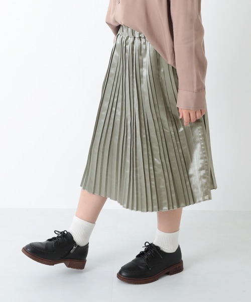 動くたびかわいい『サテンプリーツスカート』 ふんわり揺れるプリーツとサテンのような光沢感が軽やかで上品な印象を演出してくれます。 女の子らしいスタイルはもちろん、ビッグシルエットのトップスと合わせたカジュアルなスタイルにもおすすめのアイテムです。 ■素材■ 動きにあわせて変化、光沢感のあるサテン なめらかな肌ざわりで光沢があり、存在感のあるサテン生地。 プリーツ加工を施し、表情のある生地感に仕上げています。 ■ディティール■ 伸縮性:なし ・ウエストゴムでラクな着心地。ゴムの取替え口付き ・両サイドにポケット付き ・裏側にお名前タグ付き ・裏地付き