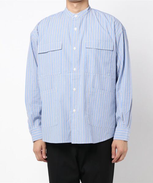 ストリート感のある目を惹くビッグシルエットデザインで旬な着こなしと存在感を発揮するストライプシャツ。 絶妙なビッグシルエットなのでスタイリッシュに魅せられるのが魅力です。 衿元はバンドカラーにしスッキリ見せることによりメリハリをつけています。